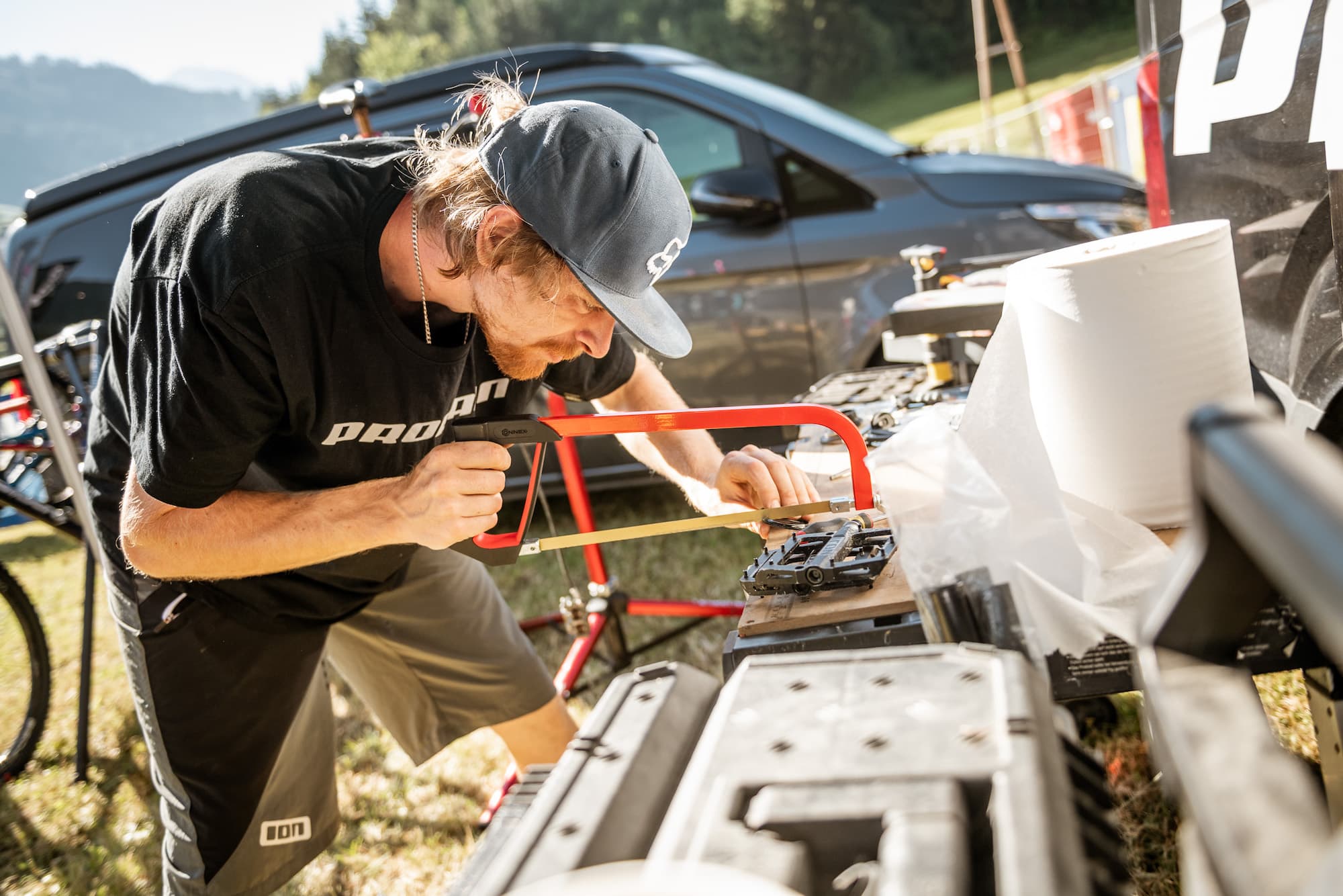 Ein gutes Jahr später stehe ich mit meinem elfjährigen Sohn Paul am Rasenmäher Bus auf dem Father & Son Days Event Gelände in Nauders und akkreditiere uns bei Karen, der Frau von Holger. Paul ist mega aufgeregt und freut sich schon wie ein Schnitzel, dass er jetzt endlich auch mal in einem Bikepark fahren darf. Denn seit unsere Nachbarn in Sölden zum Biken waren und begeistert davon erzählt haben, wie cool Flow Trails sind und wie easy es ist, wenn man mit dem Lift shuttelt, darf ich mir jeden Tag das Genöle von Paul anhören, warum wir denn nie in einen Bikepark gehen und er immer alles selbst hoch treten muss. Tatsächlich musste sich der arme Kerl bis dato seine Tiefenmeter immer selbst verdienen, Das Maximum war, dass ich ihn als er noch ein kleiner Knopf war im Fahrrad-Anhänger die Berge hoch geschleppt habe. Jetzt ist er alt genug und kann selbst treten. Das ist zumindest meine Sicht der Dinge und natürlich auch ein wenig eine Frage der Philosophie. Es ist die Art von Mountainbiken, die ich selbst von Kindesbeinen an praktiziere. Man konnte nur die Höhenmeter abfahren, die man davor hoch gestrampelt ist. Dass es mittlerweile bei uns in den Alpen oder Mittelgebirgen usus ist, die Lifte mit dem Bike zu nutzen, hätte ich mir vor 25 Jahren nicht im Entferntesten vorstellen können. Damals nach dem Abi habe ich mit zwei Kumpels einen Mountainbike-Roadtrip durch den Westen der USA unternommen. In Mammoth Lakes habe ich dann das erste Mal gesehen, wie die Amis damals schon ihre Bikes an den Sessellift oder die Gondel gehängt haben und sich somit das mühsame bergauf Treten gespart haben. Zu der Zeit dachte ich nur, die spinnen die Amis. Heute erscheint es einem fast schon so normal den Lift samt Rad zu nutzen wie im Winter zum Skifahren, zumindest hier in Nauders.