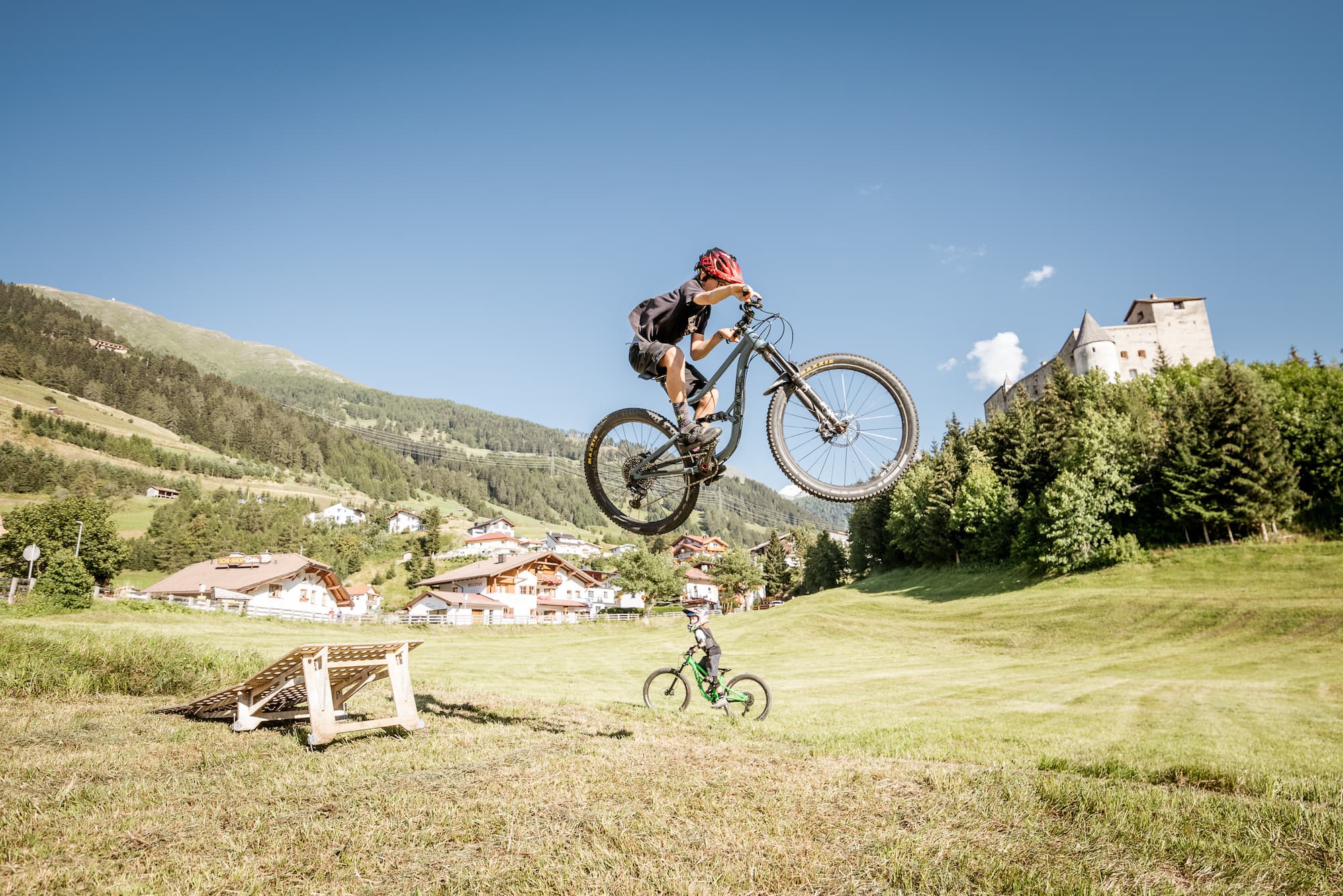 So allmählich füllt sich das Eventgelände unterhalb der Burg von Nauders mit einer bunten, bis an die Zähne hochgerüsteten Horde an jungen bis mittelalten Menschen auf Mountainbikes. Wenn ich nach der Ausrüstung urteilen müsste, dann würde ich das Niveau als recht hoch einstufen, denke ich mir. Bei der Akkreditierung konnte ich zwischen Level eins, zwei und drei wählen. Beginner ist Paul definitiv keiner mehr, Expert auch nicht, also dann die goldene Mitte – Level zwei. Zum Mountainbiker wurde Paul auf den Isar Trails. Ab dem Laufradalter sind wir unendlich viele Runde auf den Trails unterwegs gewesen. Später dann auch in Punta Ala und Massa Marittima sowie am Gardasee. Dieses Jahr entdecken wir zusammen neue Trails in der Zugspitzregion. Die Isartrails findet er aber bis heute noch cool und will immer wieder zurück. Mal schauen, wie es ihm hier auf den 3-Länder Enduro Trails in Nauders am Reschenpass taugt. Es ist das erste Mal, dass er so lange Abfahrten am Stück fahren wird und eben nicht nur eine, sondern dank Liftunterstützung gleich mehrere am Tag.