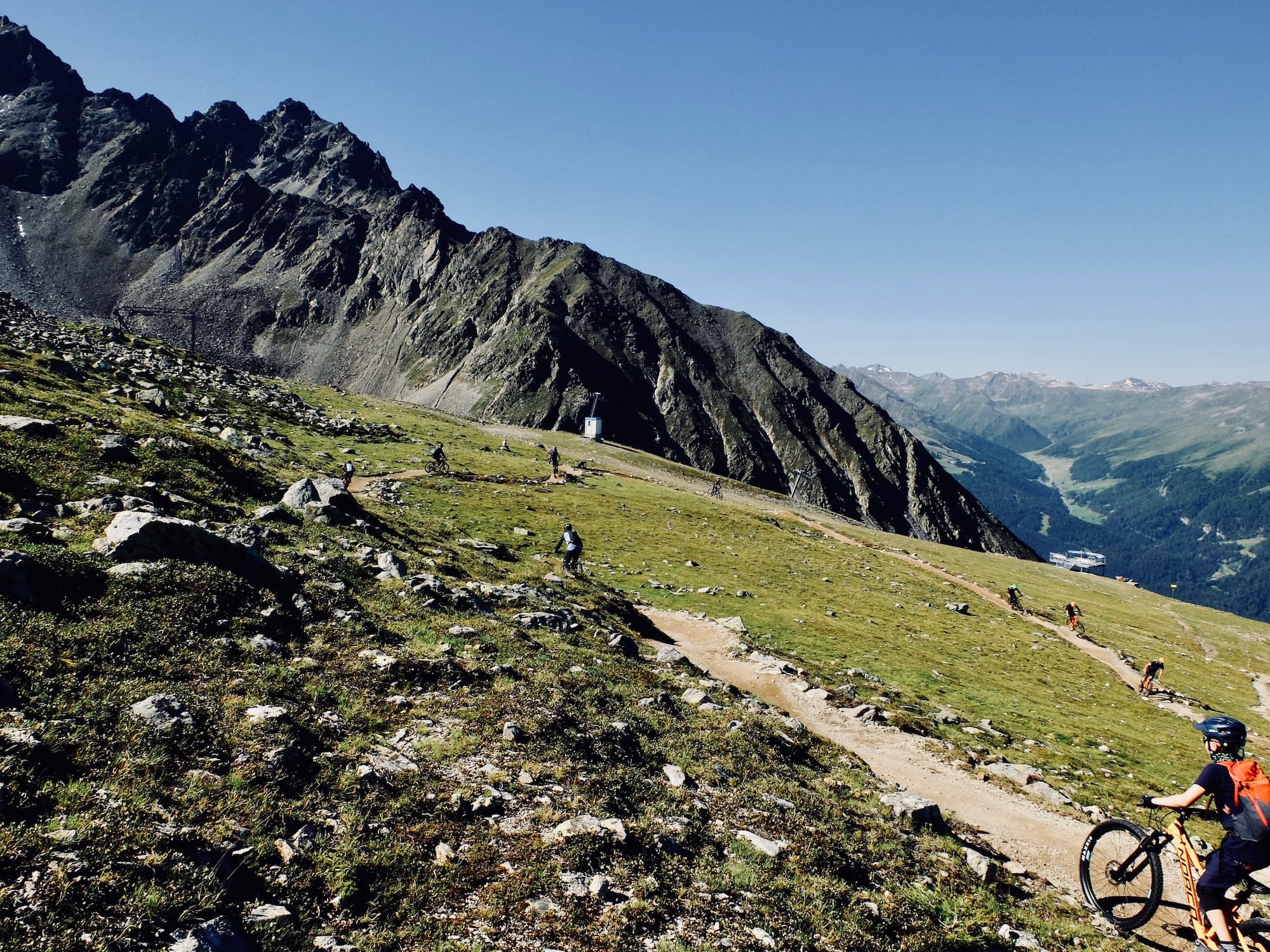 Unser Guide für die nächsten drei Tage heißt Wolfi, ehemaliger Downhill Weltcup Fahrer, Produktmanager bei Evoc und ein sehr sympathischer Zeitgenosse. Er zeigt uns nicht nur wie man auf den Trails Gas gibt, sondern sensibilisiert auch unsere Wahrnehmung für die Schönheit der Landschaft und Umgebung, in der wir unterwegs sind. Uns, das sind neben Paul und mir noch vier weitere Väter und ihre Jungs, alle miteinander sympathisch und entspannt. Schnell wird klar, dass außer uns alle nicht das erste Mal bikeparkähnlich unterwegs sind. Die Rookies geben ordentlich Gas und lassen es auf dem neugebauten Zirmtrail so richtig krachen. Von der Gipfelstation der Zirmbahn auf rund 2.500 Meter schlängelt sich der Trail über sechs Kilometer und 300 Höhenmeter wie eine Murmelbahn mit wenig Gefälle, dafür vielen Anliegern, Wellen und kleinen Tables nach unten. Ein sogenannter Flow Trail, der perfekt für Anfänger geeignet ist, um ein Gefühl für die Fahrtechnik zu entwickeln, aber auch für Fortgeschrittene nicht weniger spaßig ist.