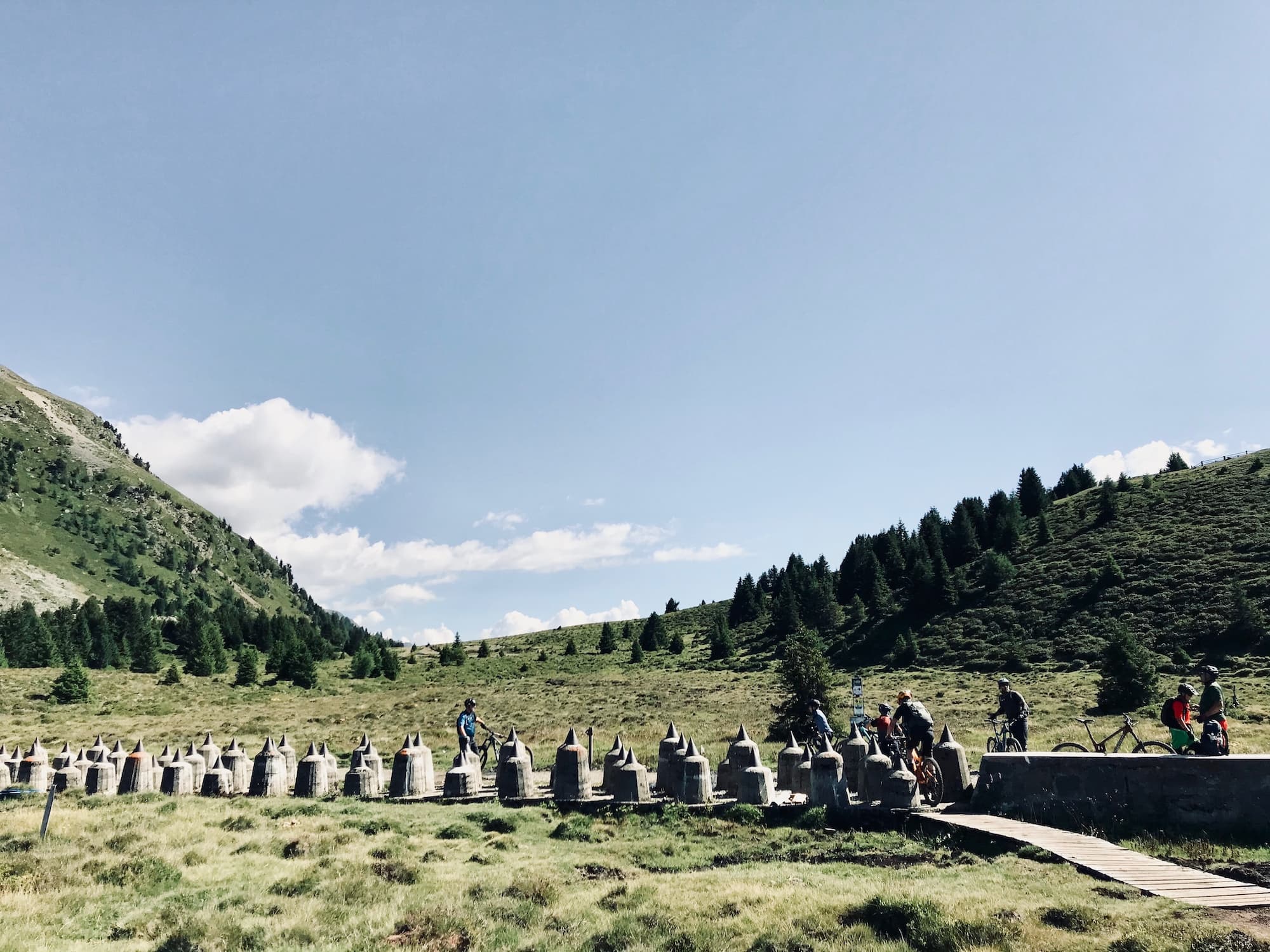 Über den Almtrail, der deutlich ruppiger ist, queren wir rüber zur Stieralm, unserem Lunch Spot der nächsten beiden Tage, um von dort auf dem flowigen Plamort Trail durch lichten Lärchenwald und eine Art Hochmoor Richtung italienische Grenze zu cruisen. Markiert wird die grüne Grenze zwischen Österreich und Italien durch die berühmte Panzersperre, durch die wir uns samt Räder hindurchzwängen. Zusammen mit einer Bunkeranlage wurde sie von den Italienern kurz vor dem zweiten Weltkrieg zur Grenzsicherung errichtet. Von hier ist es nur noch ein Katzensprung zum bekannten Aussichtspunkt oberhalb des künstlich aufgestauten Reschensees, bekannt durch den aus dem Wasser ragenden Kirchturm. Das Panorama ist gewaltig. Direkt vor uns thront Südtirols höchster Berg, der majestätische anmutende Ortler mit seiner 3.905 Meter hohen, vergletscherten Spitze und zu seinen Füßen liegt der türkisgrüne See. Jedesmal wenn ich über den Reschenpass ins Vinschgau komme und sich dieses atemberaubende Panorama vor mir aufbaut, bekomme ich eine Gänsehaut und das schon seit über 35 Jahren. Wir stoppen für ein Gruppenfoto, inhalieren die wahnsinnig schöne Landschaft und fahren dann weiter Richtung Bunker Trail, den wir links liegen lassen.