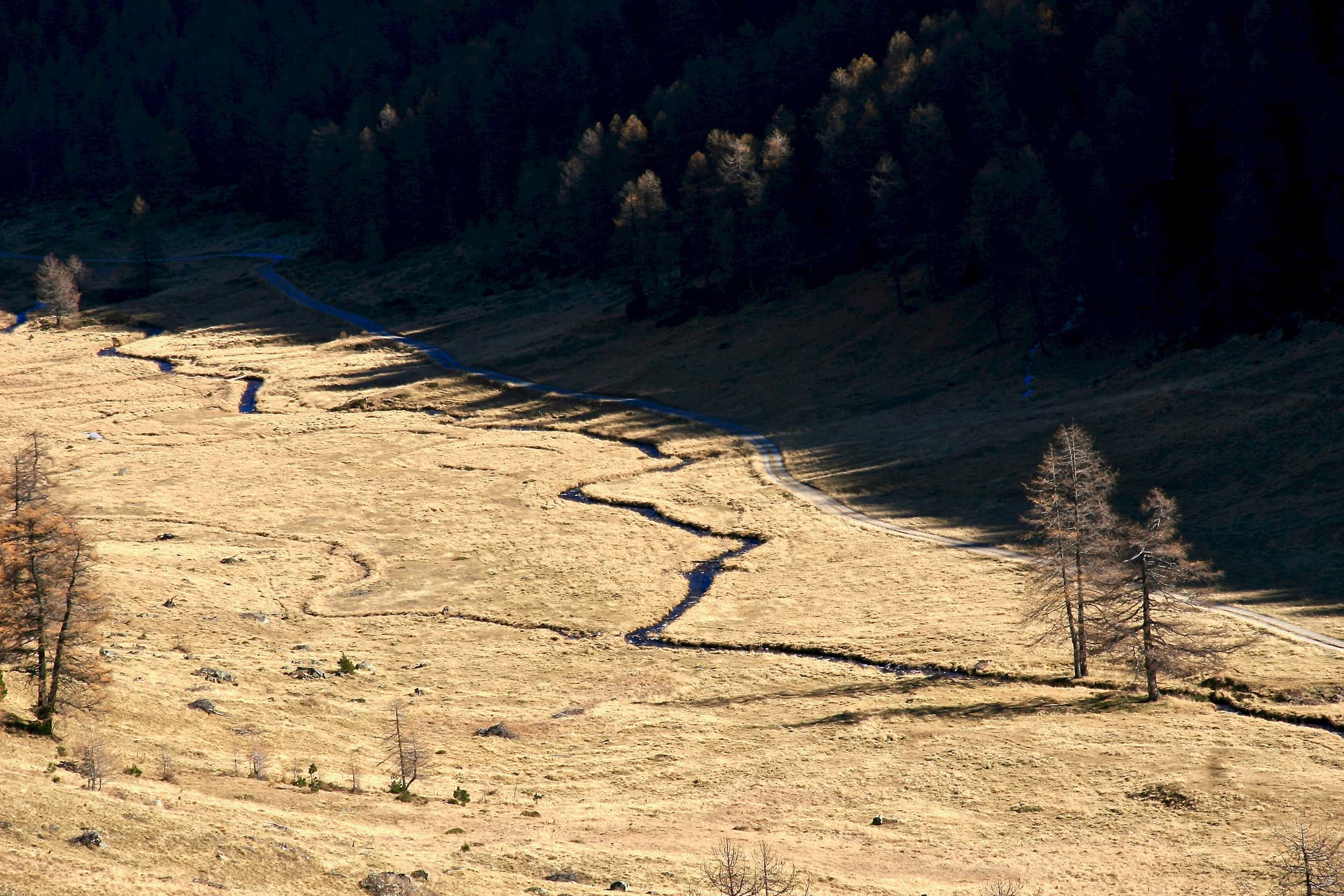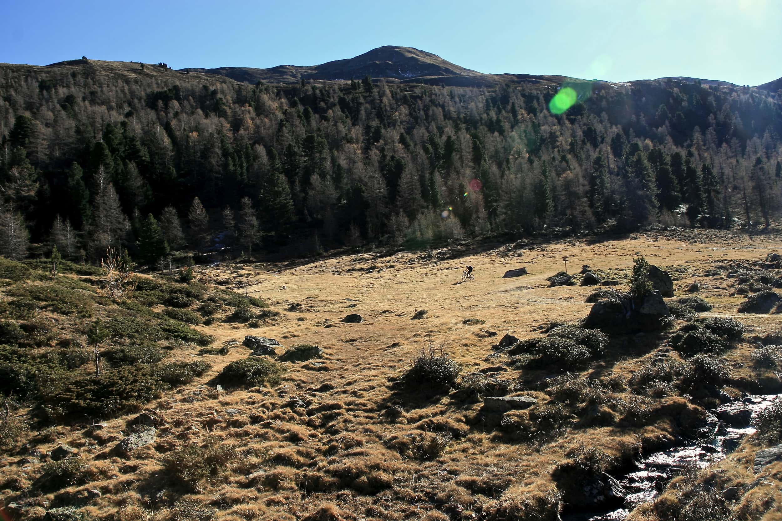 Nachdem man ihr euch satt gesehen habt, heißt es Sattelstütze einfahren und los geht’s. Ein verspielter, leicht zu fahrender Trail (Weg Nummer 4) zirkelt durch eine mondartige Landschaft hinunter zum Pfaffensee (2.222 Meter) und von dort auf einem breiten Schotterweg bis zur Plantapatsch Hütte und weiter Richtung Talstation und Prämajur. Kurz vor der Talstation biegt ihr links auf einen Karrenweg in Richtung Burgeis und Bergsee (Weg Nummer 3/3B) ab. Nach rund einem halben Kilometer folgt ihr dem Weg 3 rechts steil bergab über eine Wiese bis zum Bergsee und von dort auf einem Trail zurück ins Dorf.